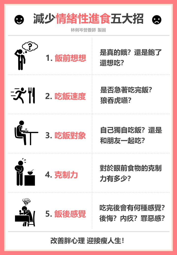 因此,我們該如何去管理自己的負面情緒,才會決定我們會不會進行「情緒化進食」。透過以下這五個關鍵問題,希望大家在「進食前」先靜下心來想想,問一問自己,就可以幫助你減少情緒性進食的機會唷!俐岑也製作了「減少情緒性進食懶人包」,分享給大家。