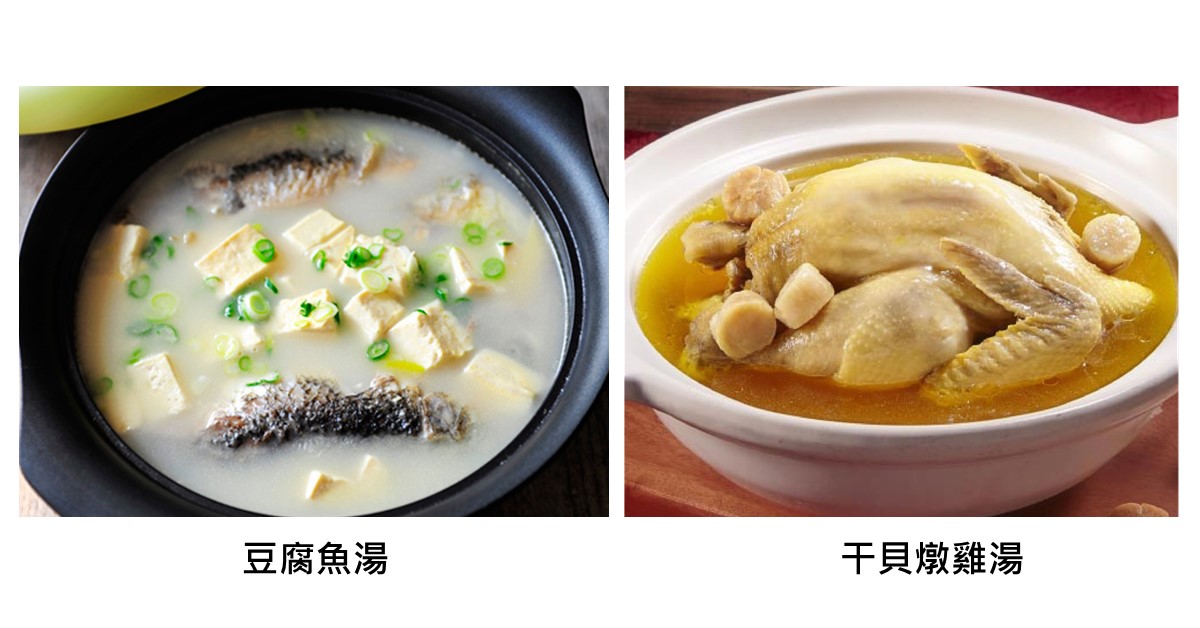 花生燉豬腳、鱸魚湯、烏骨雞湯等,這些湯品裡面富含膠質,不僅喝湯之外,最好連魚肉、雞肉也一併攝取,優質的蛋白質食物更有助於乳汁分泌。