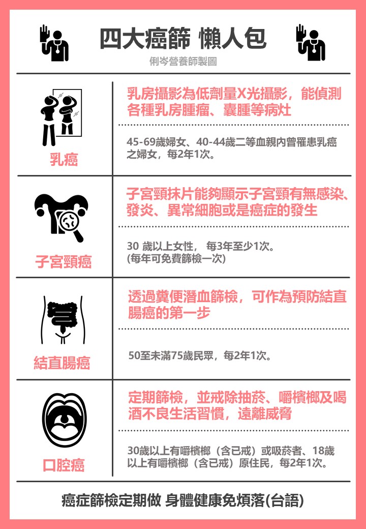 健診中心的全身性檢查,費用比較高,若預算有限的人,建議可以多多利用政府所推廣的「四大癌篩」(如下圖俐岑所製作的四大癌篩懶人包),再搭配上一般的血液生化數值檢測,也可以做到初步的健康篩檢唷!老話一句,平時的保養我覺得非常重要,不過度頻繁攝取會損害健康的飲食,留意營養的均衡度,還有運動真的很重要,今年我也把運動列入一定要執行的項目之中。