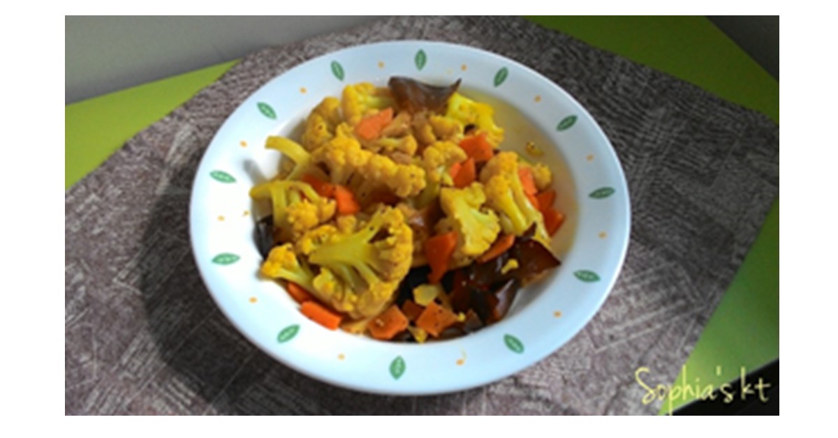 白花椰菜、黑木耳洗淨切好備用;取一滾水鍋,加入白花椰菜殺菁川燙至半熟後撈起備用;再取一平底鍋,加入苦茶油後,依序放入紅蘿蔔、黑木耳拌炒,最後加入白花椰菜及咖哩粉、薑黃粉一同拌炒白花椰菜,然後加上適量開水,蓋上鍋蓋煮至熟透後,撒上適量黑胡椒粒後拌勻,即可盛起裝盤。