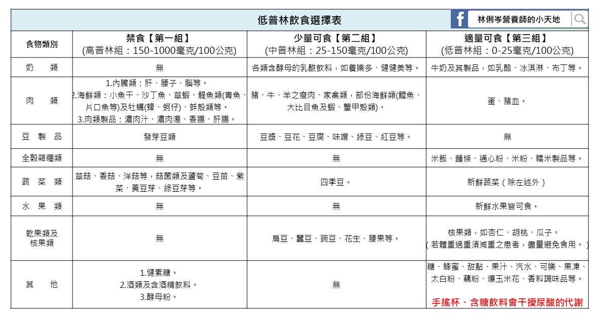 均衡攝取蛋白質食物,勿大量吃。普林是核蛋白質代謝之後的產物,和蛋白質豐富的食物像是動物內臟(雞肝、鴨肝、豬肝等)、小魚乾、紅肉類等;植物的話像是會發芽的部分含量較多,如胚芽、黃豆芽、豆苗等,以及香菇、蘆筍、紫菜等減少攝取。